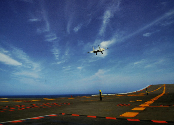 资料图:歼-15舰载战斗机在“辽宁舰”上触舰复飞。