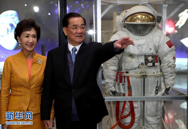 2月27日,中国国民党荣誉主席连战一行在中国航天员科研训练中心参观舱外航天服设备。